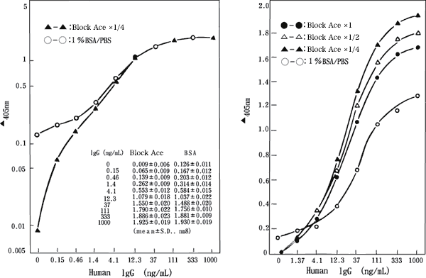 包被抗人κ链抗体和抗人λ链抗体,并用Block Ace和1%牛血清白蛋白(BSA)进行封闭处理。人IgG ELISA实验结果表明:Block Ace具有更低的背景值,且标准曲线斜率更陡。