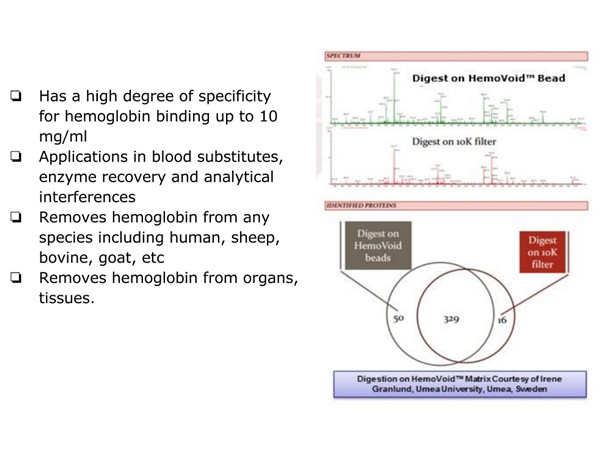 结合在HemoVoid™上的低丰度富集亚蛋白质组可被高效洗脱下来,且血红蛋白残留极低。该产品非常适合用于发现与靶向蛋白质组学、酶活检测、免疫分析、微阵列、一维/二维凝胶电泳与LC-MS等应用。