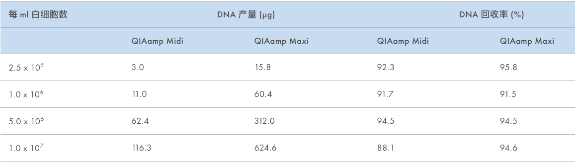 QIAamp DNA Blood Midi Kit的DNA回收率最高可达94.5%;QIAamp DNA Blood Maxi Kit的DNA回收率最高可达95.8%,具体取决于起始细胞密度。