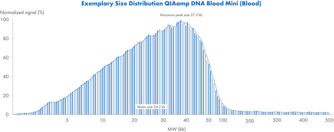 | 使用QIAamp DNA Blood Mini Kit(血液)的典型大小分布 使用QIAamp DNA Blood Mini Kit从细胞中提取DNA的典型大小分布。使用Femto Pulse System分析了样本,并将信号归一化为最大峰值。 |